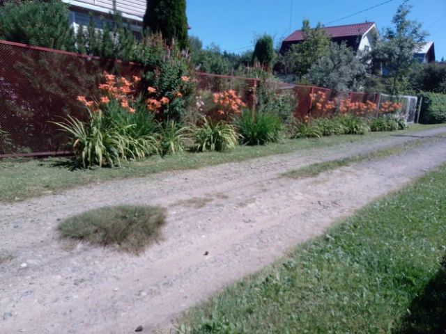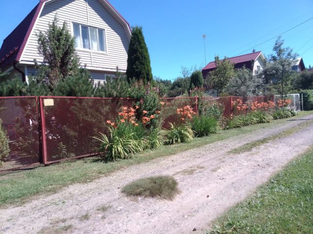 С улицы - надежный забор из металлопрофиля с калиткой и откатными воротами. Остальная часть участка - сетка-рабица, участок не "душит", продувается, но в то же время защищает от чужих животных .