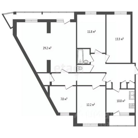 4 изолированные комнаты площадью 13,5 м2, 12,2 м2, 11,8 м2, 7 м2.