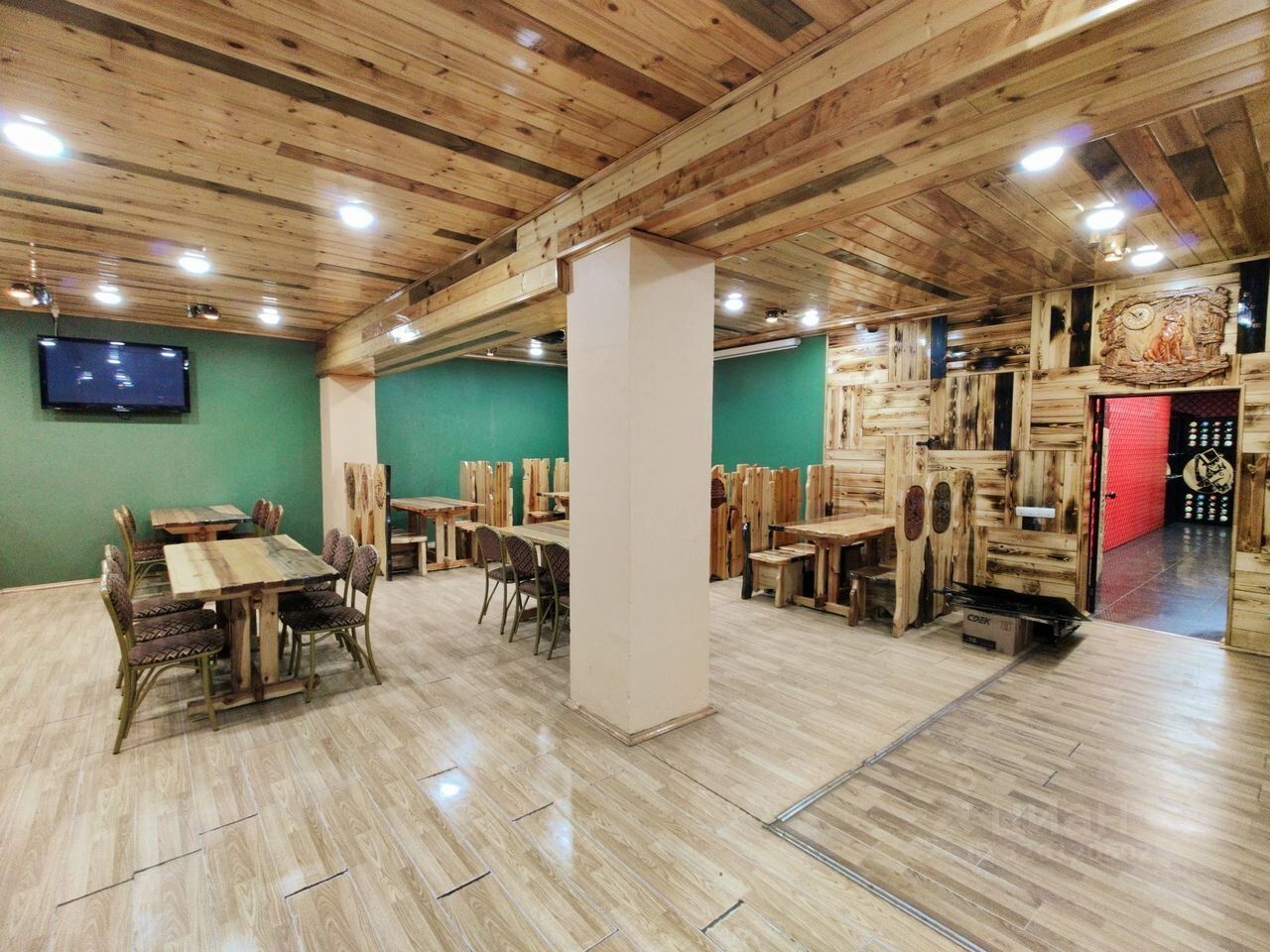 - 1 этаже (743,7м.кв) расположен Ресторан, Банкетный зал, Танцпол, Бильярдная, Баня с бассеином бассейном — можно использовать для SРА-зоны или оздоровительного центра. Оснащен всем необходимым оборудованием, инвентарем и мебелью для работы в сфере общественного питания.