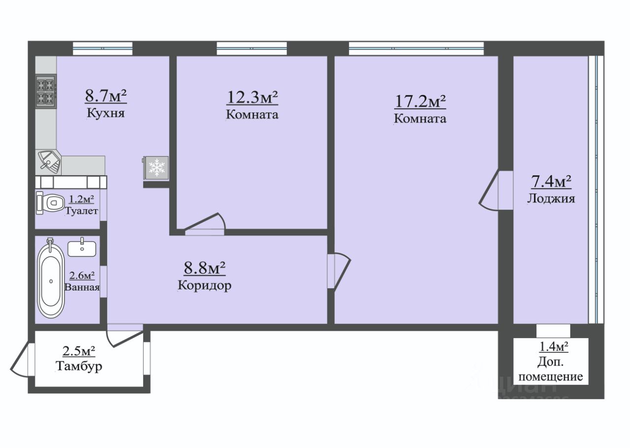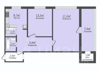 Продаётся Чистая, Тёплая 2-ух комнатная квартира. Два собственника. Все комнаты Изолированные(17.2м²,12.3 м²), санузел Раздельный(2.6 м²,1.2 м²), кухня(8.7 м²), коридор(8.8 м²), Лоджия(7.4 м² коэффициент по реестру 1/2) + дополнительное помещение(1.4 м²). Высота потолков(2.5 м). С соседями есть общий тамбур(2.5 м²) Дополнительно общая дверь. Метал.(порошковое напыление), морозостойкая + шумоизоляция.