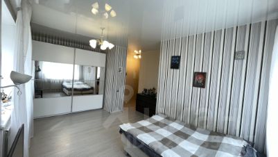 Просторная комната с большим шкафом-купе для хранения, натяжные глянцевые потолки создают много пространства.