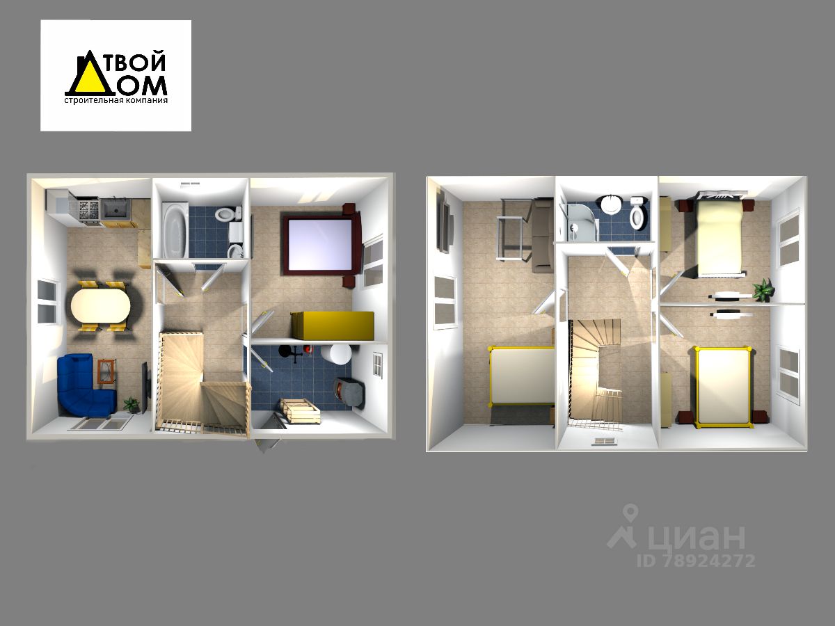 - 2-й этаж: 3 комнаты 17/9/9 м2, холл, санузел 3 м2 (унитаз, раковина)